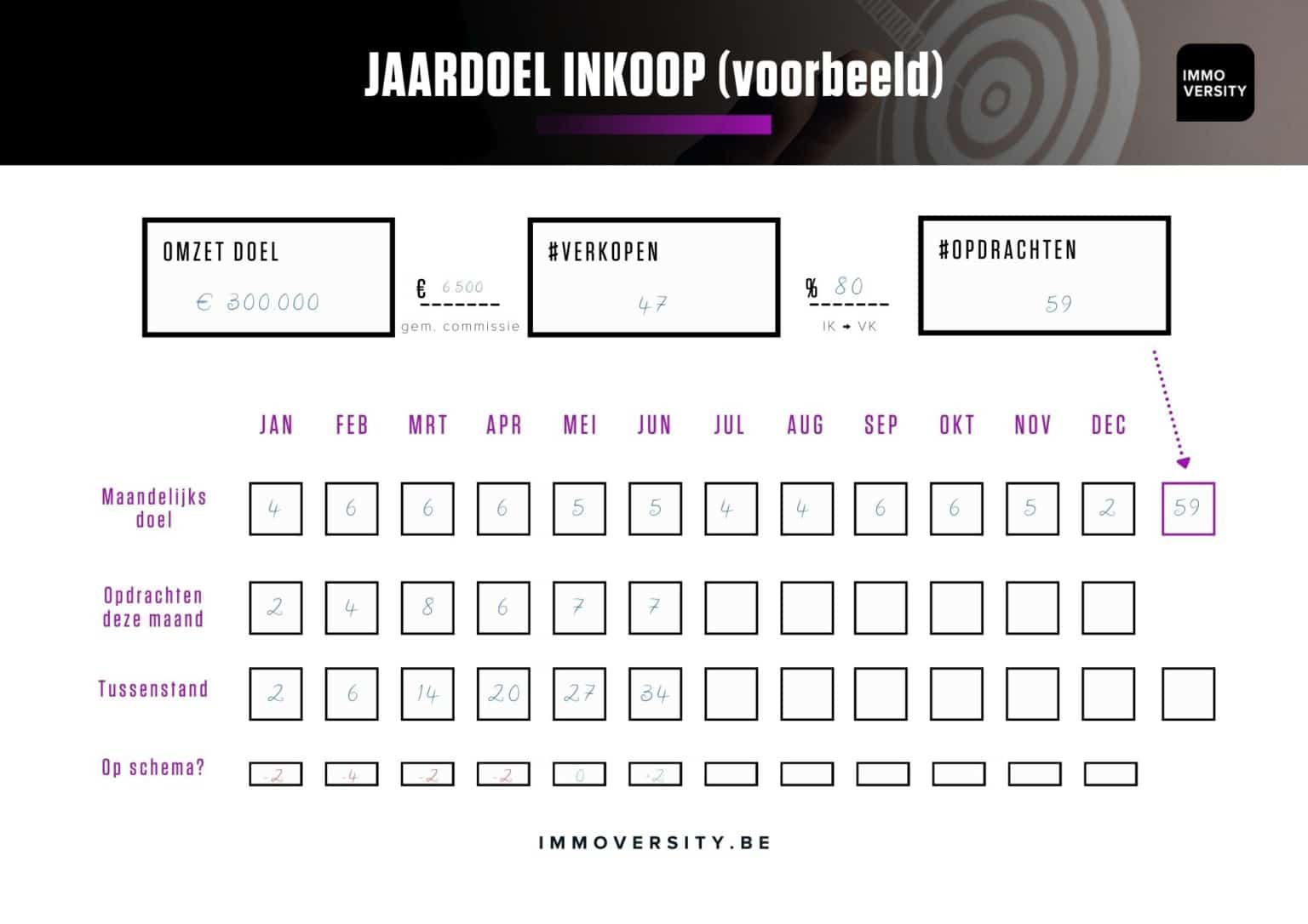 (Het maandelijkse doel moet opgesteld worden aan de hand van het aantal inkoopopdrachten, niet perse door de verkoop want daar heb je minder controle over.) - Vul elke maand in en stuur bij waar nodig